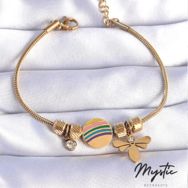 Çelik Gold Renk Zirkon Taşlı Gökkuşağı Tasarımlı Yusufçuk Bileklik