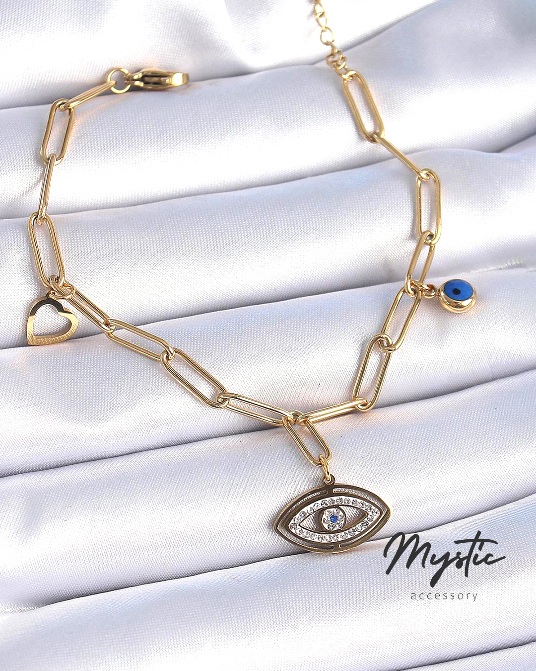 Çelik Gold Renk Zirkon Taşlı Göz Figür Kalp Detay Kadın Bileklik