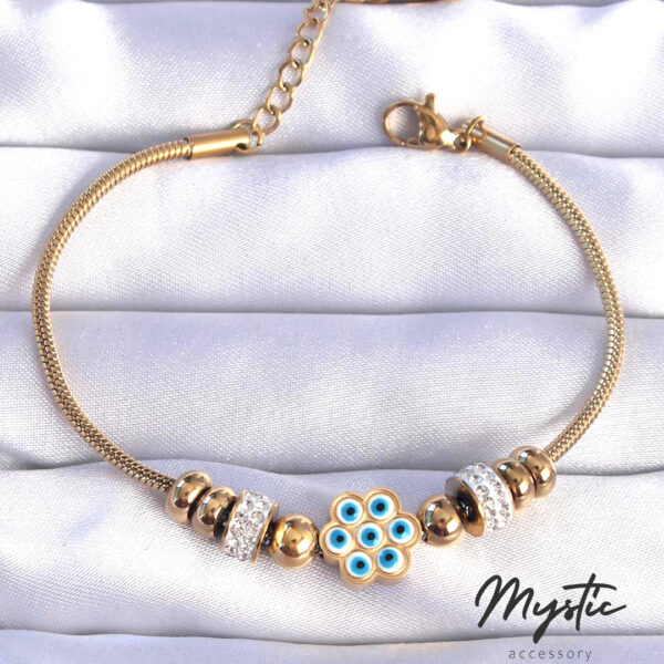 Çelik Gold Renk Zirkon Taşlı Nazarlı Çiçek Tasarımlı Bileklik