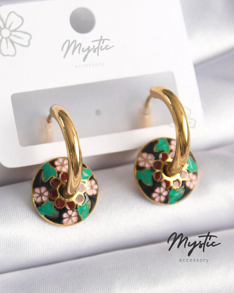 Pirinç Gold Renk Beyaz Siyahlı Renkli Motif Desenli Kadın Küpe